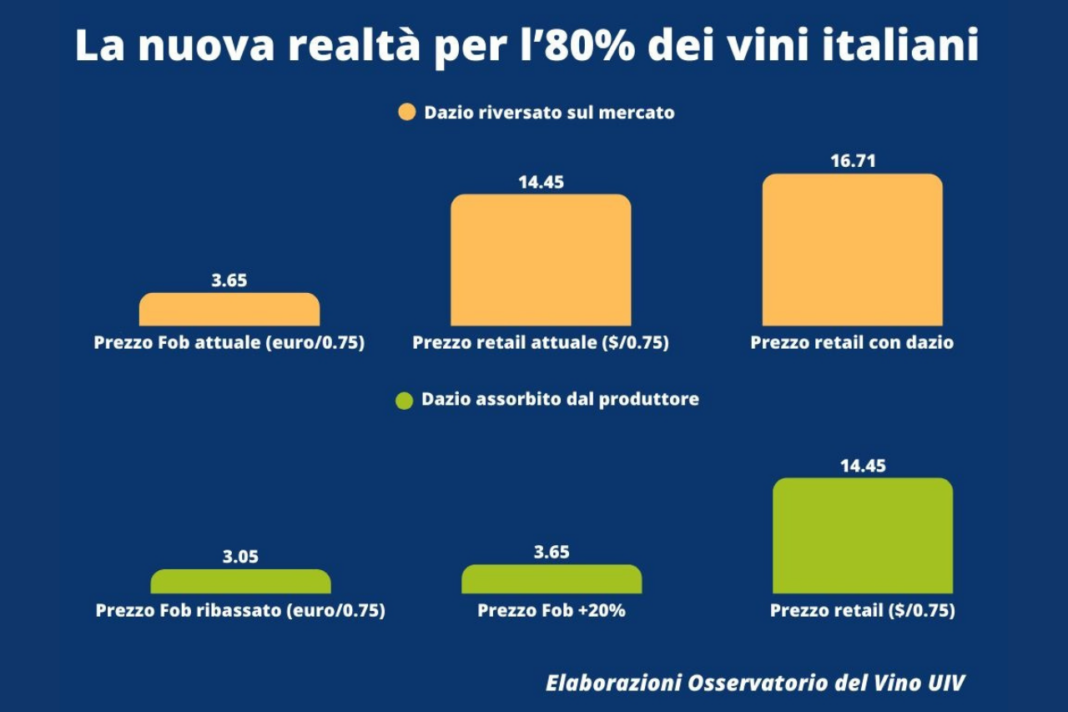 Per Frescobaldi: “Uiv ritiene che tutta la catena – dalla produzione al punto vendita – debba sacrificare parte dei ricavi per garantire listini invariati al punto vendita, pena l’uscita dal mercato di tante realtà del nostro settore”. Un “sacrificio”, secondo l’Osservatorio Uiv, stimato in 323 milioni di euro l’anno che riguarda 480 milioni di bottiglie spedite oltreoceano.