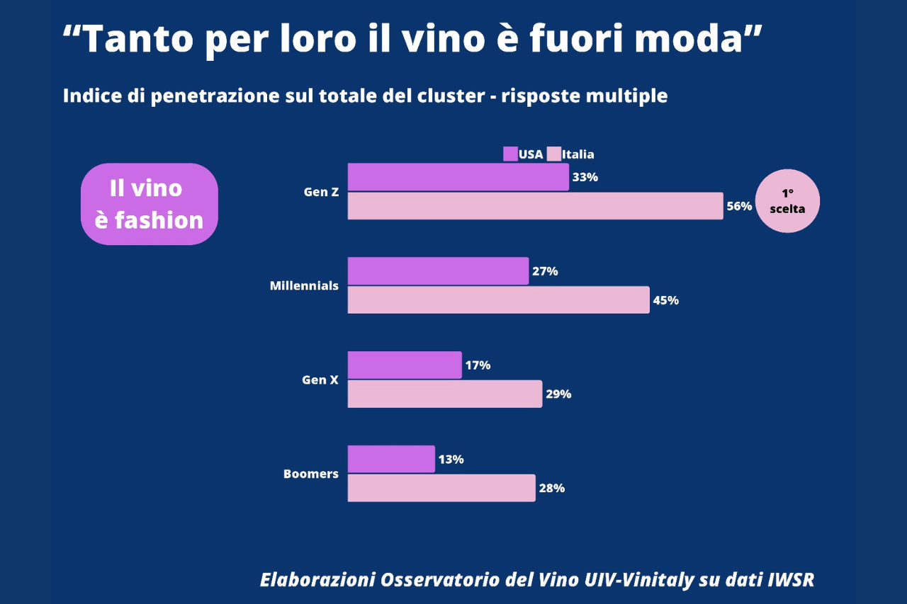 Il connubio vino e cibo rimane importante, ma sembra perdere centralità per i young winelover americani e italiani. Se è vero che “il vino esalta il cibo” per la grandissima parte degli over44, scendono sotto alla metà quelli che si riconoscono in questa affermazione tra i Millennials e la GenZ. Di contro, nel Belpaese la quota dei giovanissimi italiani che vede il vino come un “fashion statement” è esattamente il doppio (56%) di quella dei boomer (28%), e anche i Millennials staccano i GenX per 16 punti percentuali (45% contro il 29%). Un trend rilevante, per cui Iwsr ha coniato una nuova categoria, quella degli “Status Seekers” che, pur rappresentando solo l’11% dei consumatori abituali di vino, negli Stati Uniti realizzano il 24% del volume e il 35% dei valori generati dai regular wine drinkers.