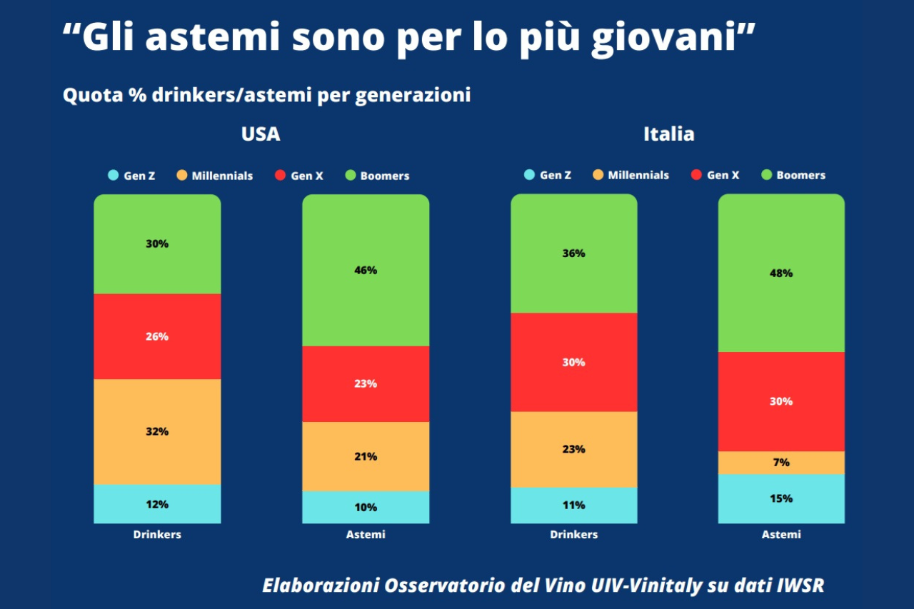 Su entrambe le piazze quasi la metà degli astemi appartengono alla generazione Boomer, seguiti dalla GenX (23% negli Usa e 30% in Italia). GenZ e Millennials rappresentano complessivamente solo 3 astemi su 10 negli Stati Uniti e 2 su 10 in Italia. La tendenza sober curious si inverte nel caso dei cosiddetti periodi “dry”, che negli Usa vedono in prima fila gli under44, con una quota disposta a parentesi temporanee di astinenza che tra i più giovani (GenZ) raggiunge il 60% negli Usa e il 46% in Italia. Più bassa la propensione degli over, con share che si attestano attorno al 30% negli Usa e al 25% in Italia.