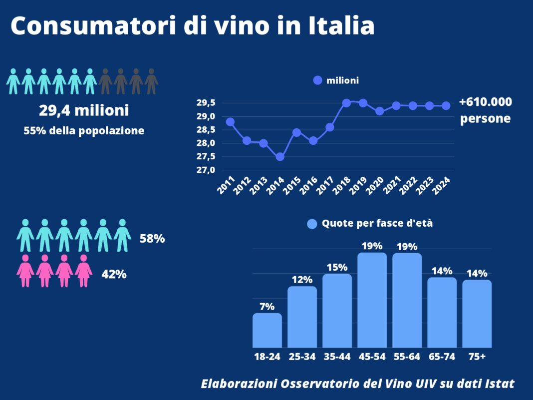 Si beve meno ma aumenta la platea. È un’evoluzione che rispecchia il grado di maturità nel rapporto degli italiani con il vino: più consapevoli, più moderati e più in linea con la ricerca edonistica e qualitativa del consumo. Ad allargare la platea sono, a sorpresa, proprio i più giovani, che incidono meno sui consumi solo perché in termini numerici sono inferiori anche solo rispetto a 20 anni fa. È vero – afferma l’analisi – che i pesi più marcati tra gli user si evidenziano tra le fasce mature/anziane, con una quota al 66% per gli over 45, ma è altrettanto vero che la pur piccola (vale il 7% dei consumatori) fascia 18-24 anni è l’unica ad aver visto crescere significativamente la propria quota: +8 punti percentuali rispetto al 2011 (dal 39% al 47%), a fronte di una stabilità nelle fasce più mature, e una perdita tra i Millennials (29-44 anni) in testa.
