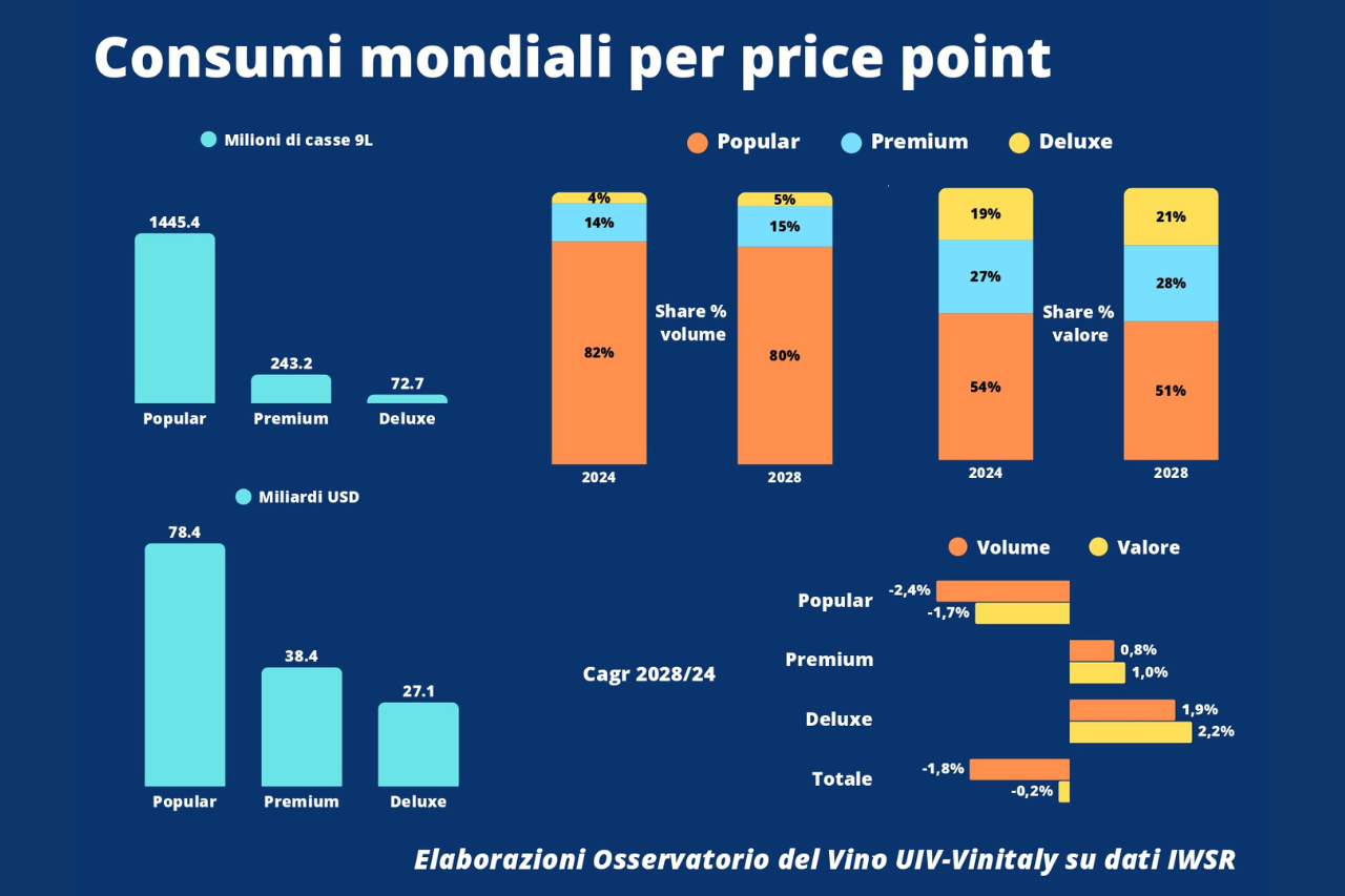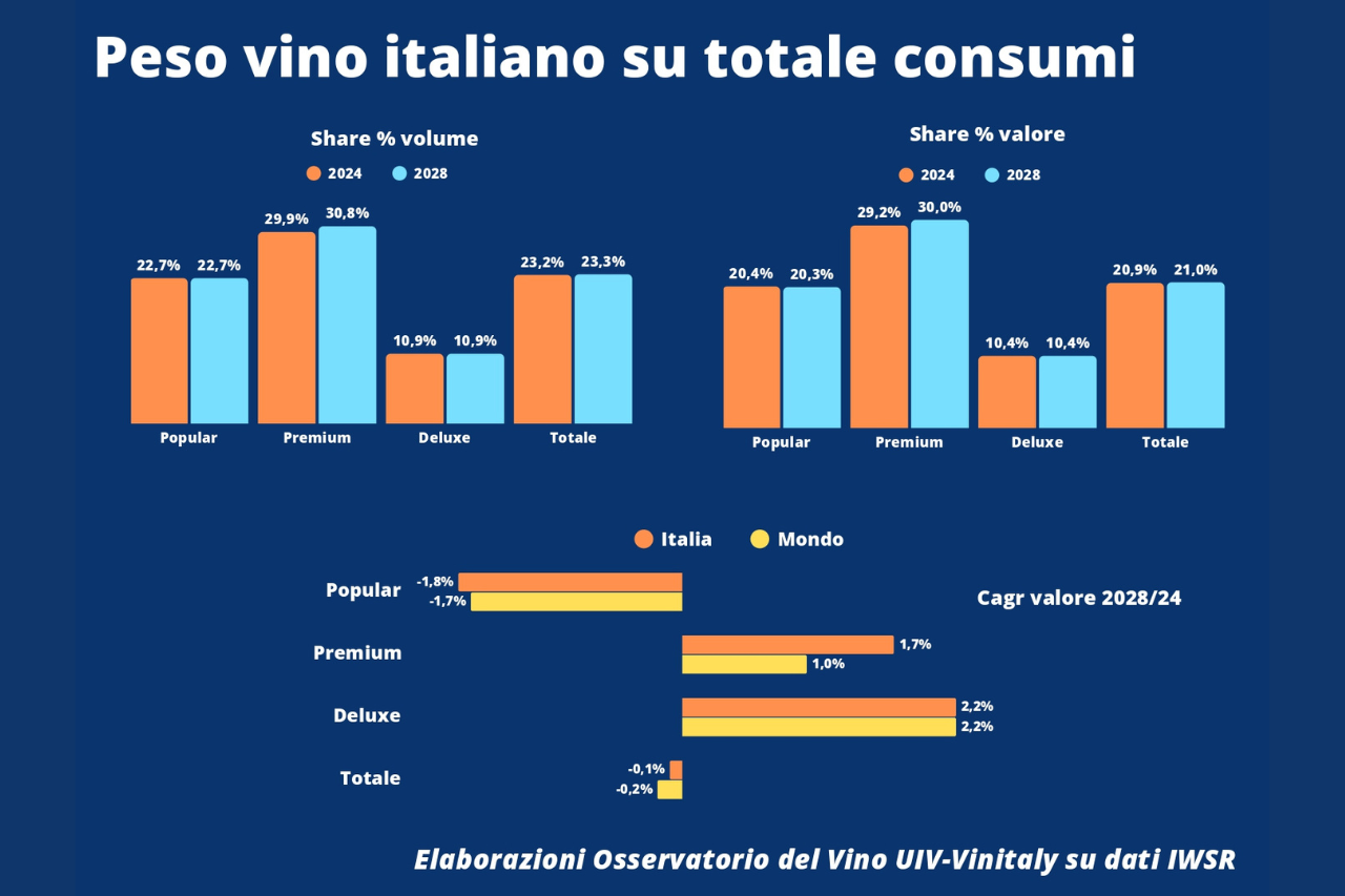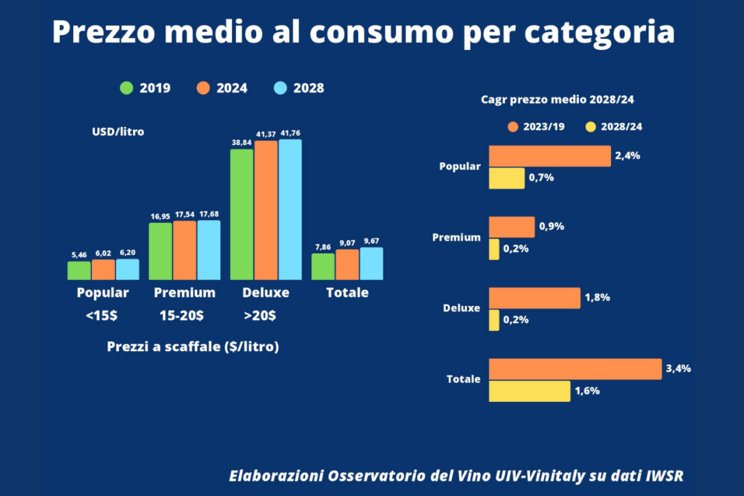 Per l’Italia – annota l’Osservatorio – gestire questa fase sarà tutt’altro che semplice, visto che le fasce Luxury sono presidiate in maniera quasi blindata dalla Francia, ma anche dai vini made in US. La differenziazione dei mercati potrebbe essere una strategia da perseguire, ma la redistribuzione verso l’alto della parte più “nobile” dei Premium si scontra con il fatto che oggi Super, Ultra Premium e Luxury sono per il 44% venduti negli Stati Uniti, dove fra l’altro smuovere i price point è operazione altamente rischiosa, e gli altri mercati principali (Francia, UK e Giappone) sono ampiamente presidiati dai francesi. Eppure – conclude l’Osservatorio Uiv-Vinitaly -, bisognerà lavorare perché la parte più qualificata dei Premium odierni trovi collocazione nei segmenti Ultra Premium e oltre, i soli previsti in decisa crescita da qui al 2028 a livello mondiale, sia a volume che a valore (+2% annuo).