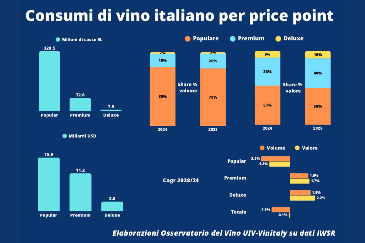 “Il tema della ricerca di un posizionamento più alto dei vini italiani è tutt’altro che un discorso naif – dice il responsabile dell’Osservatorio Uiv-Vinitaly, Carlo Flamini – negli ultimi anni, causa inflazione e pressioni straordinarie sui costi di produzione, una massa enorme di prodotto Popular si è spostata quasi per inerzia verso le fasce più economiche della categoria Premium, di fatto creando concorrenza verso il basso su questa fascia vitale per le nostre produzioni. E il fenomeno non è destinato a ridursi: da qui al 2028 il segmento Premium italiano vedrà una crescita zero del prezzo medio, contro il +1% annuo dei Low Value-Popular”. Possiamo a tutti gli effetti dire che i Premium wines sono la categoria che più andrà sotto pressione nel prossimo futuro”.