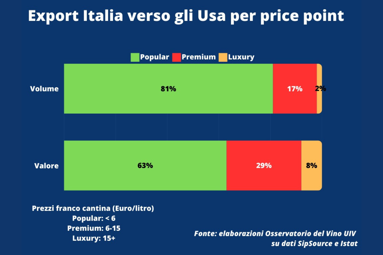 Secondo l’Osservatorio Uiv, i dati ufficiali dicono che la media di prezzo export verso gli Usa è di 5,35 euro per litro per il vino italiano, solo il 30% dei “popular” è tutto sommato allineato (5,26 euro), mentre oltre la metà è ben sotto soglia (3,53 euro). Tariffe supplementari del 25%, non gestite in equità tra le controparti, finirebbero per sbalzare questi vini sulla fascia immediatamente superiore, la “premium”. In pratica il grosso delle produzioni tricolori: dal Pinot grigio al Prosecco, dal Chianti al Lambrusco, dal Moscato d’Asti ai vini siciliani, a quelli della stragrande maggioranza delle regioni italiane. Il segmento premium che oggi vale il 17% volume del totale export (con prezzo medio franco cantina di 8,80 euro/litro e price point al dettaglio variabile da 13 fino a 30 dollari la bottiglia), non sarebbe ovviamente in grado di assorbire travasi “epocali” di referenze provenienti dal basso.